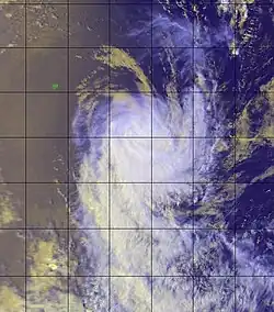 While Eline was making landfall on Madagascar, another area of convection formed to its east on February 17 within the ITCZ. Its structure was similar to a monsoon depression, due to a large circulation with weak winds near the center.[3] However, it was organized enough to be classified as a tropical disturbance on February 18 to the southeast of Diego Garcia.[38] It moved southeastward with increasing convection, prompting the Mauritius Meteorological Service to name it Felicia while still as a tropical depression on February 20. The convection however remained disorganized, and there were several small circulations within the broad gyre. After turning to the southwest due to a nearby trough, Felicia's circulation became more compact, as evidenced by a QuikSCAT pass. Outflow increased as wind shear decreased, and Felicia became a moderate tropical storm on February 21.[3] On the same day, the JTWC initiated advisories on the storm as Tropical Cyclone 12S.[13]