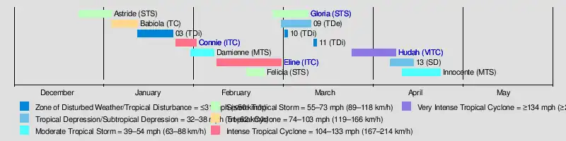Despite the destructive nature of the season, it began later than usual. Cyclone Astride originated toward the end of December, bringing rainfall and gusty winds to northern Madagascar while in the region. In January, Cyclones Babiola and Connie both formed east of Madagascar and took southerly tracks. Connie passed near Réunion island, producing 1,752 mm (69.0 in) of rainfall in the mountainous peaks and killing two people. Eline, the longest lasting storm of the season, struck Mozambique while the country was experiencing its worst flooding in 50 years, collectively causing around 700 deaths and about $500 million in damage. The storm also killed 12 people in Zimbabwe and 21 in South Africa. Just two weeks after Eline struck Madagascar, Tropical Storm Gloria affected the same general region, bringing additional deaths and damage. Cyclone Hudah in April was the strongest storm of the season, reaching peak 10‑minute winds of 220 km/h (140 mph). It caused three deaths in Mozambique, although its effects were worse in Madagascar, where there were 111 deaths. The final storm of the season was Tropical Storm Innocente, which dissipated on April 24. In addition to the named storms, there were four unnamed tropical disturbances or storms, as well as one subtropical cyclone that formed in the southern Mozambique Channel.
