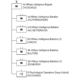 - 3rd Military Intelligence Battalion (TA), HQ in London (supporting HQ ARRC, Permanent Joint Headquarters, and Defence Intelligence Staff)[5]