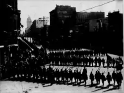 American troops performed occupation duty in the city, with the First Nebraska policing the waterfront district near the customs house.[17] Tensions remained between the Americans and the Spanish and with the Filipino rebels under General Emilio Aguinaldo, who desired independence for the Philippines.[18] Soldiers in the occupying American forces often referred to the locals by racial slurs, and some of the soldiers behaved in a hostile manner towards the Chinese minority population of Manila. Some looting occurred as well.[19] Bratt was sent home due to illness in September, and John M. Stotsenburg was promoted to colonel to command the regiment on October 4.[20] Disease caused many illnesses and deaths in the unit, and 300 soldiers were discharged in December and shipped back to the United States due to illness or infirmity. The losses to illness were partially offset by the arrival in late November of the additional recruits that had been authorized in June.[21] In December, the regiment was transferred to Camp Santa Mesa, which was in a salient of the American lines outside of Manila that would allow the regiment a route with which to quickly take the city's waterworks if needed.[20]
