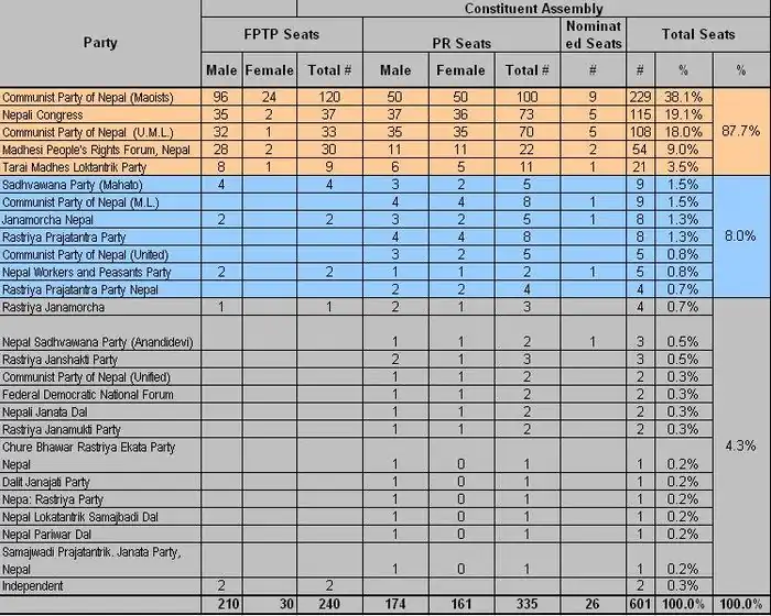 240 members were elected in single-seat constituencies, 335 were elected through proportional representation,[4] and the remaining 26 seats were reserved for nominated members.[5] The Communist Party of Nepal (Maoist) [CPN (M)]—now re-formed as the Communist Party of Nepal (Maoist Centre)—was the largest party in the Constituent Assembly, having won half of the constituency seats and about 30% of proportional representation seats.[6]