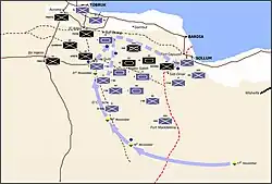 The same day, Rommel committed himself to a "dash for the wire" – with the intention of exploiting the disorganisation and confusion in the enemy's bases and cutting their supply lines. The Germans attacked towards Egypt to relieve his garrisons at Bardia and Sollum.[55] The advance came on a route that took the Afrikakorps in succession through the headquarters of XXX Corps, 7th Armoured Division, 1st SA Division, 7th Support Group and 7th Armoured Brigade.[56] By 1145 General Norrie stated that the "Matruh Stakes" had officially started – as 8th Army A and B Echelons hurriedly withdrew east (Point 5 Map 3).[56] However, fighting continued at El Duda north west of Sidi Regez, with the South Africans being involved in fierce battles in Die Kessel[nb 10] of Sidi Regez on 29 and 30 November.[57] But the pressure was too great and an eastward withdrawal was inevitable. Finally, the Afrikakorps stalled as it outran its supplies and met stiffening resistance. By early December, Rommel had withdrawn to a line of defences west of Tobruk at Gazala, and the division occupied defensive positions at Mersa Matruh.[58]