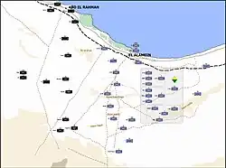 For what was to become the final South African assault on the Axis forces (Operation Lightfoot), the division was tasked attack on a two-brigade front to secure the southern end of Mieiriya Ridge. The Indian 4th and Northumbrian 50th Divisions were deployed to their south and to the north, was the 2nd New Zealand Division.[91] The South Africans were to attack towards the south west with 2nd SA Infantry Brigade (Brig. W.H.E. Poole) on the right and 3rd SA Infantry Brigade (Brig. R. Palmer) on the left. 1st SA Infantry Brigade was deployed further south and was responsible for creating an anti-tank screen to protect the left flank of the South African attack[92] (See Map 4). The Australians and Highlanders were to force a northern corridor through the Axis minefields while the New Zealanders and South Africans were to do the same in the southern sector.[93]