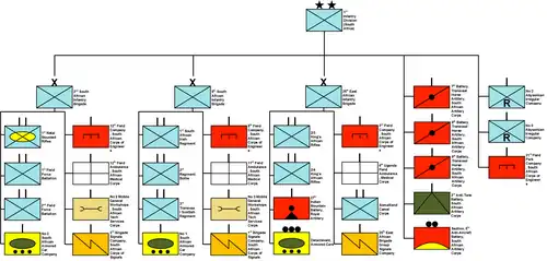 Operation Lightfoot started at 2140 on 23 October with a five-hour fire plan, the start of which signified H-Hour for the infantry assault.[94] Pienaar had deployed each of the lead brigades, with on battalion leading for the first phase to the "red line" – after a pause of an hour and a quarter, the two trailing battalions would pass through to the final objective on Miteiriya Ridge. 1st Brigade – who was not part of the main advance was provided with a special force of armoured cars, machine guns and anti-tank guns to guard their and the division's left flank (Refer Map 4). They were also allocated a mobile element of the 8th Royal Tanks. The divisional artillery, reinforced by three troops from X Corps was to fire a fire-plan of timed concentrations – using smoke on the intermediate and final objectives to cover re-organisation and to help with direction finding.[95]