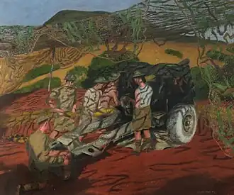The brigade was once again part of 48th (SM) Division, which had also reformed in 1920.[18][49] In 1924 the RFA was subsumed into the Royal Artillery (RA), and the word 'Field' was inserted into the titles of its brigades and batteries.[6][16][73][74] The establishment of a TA divisional artillery brigade was four 6-gun batteries, three equipped with 18-pounders and one with 4.5-inch howitzers, all of World War I patterns. However, the batteries only held four guns in peacetime. The guns and their first-line ammunition wagons were still horsedrawn and the battery staffs were mounted. Partial mechanisation was carried out from 1927, but the guns retained iron-tyred wheels until pneumatic tyres began to be introduced just before World War II.[75] In 1938 the RA modernised its nomenclature and a lieutenant-colonel's command was designated a 'regiment' rather than a 'brigade'; this applied to TA field brigades from 1 November 1938.[7][16][73]