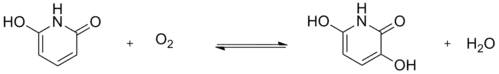 Another reaction of 2,6-dihydroxypyridine highlights its function as a substrate for oxygenase. One example is the enzyme monooxygenase, which oxidizes the substrate by transferring one oxygen atom of O2 to the substrate. The other oxygen atom is reduced to water. The product of the oxidase reaction was determined to be 2,3,6-tri-hydroxypyridine because of the results of the stoichiometry as well as the results of the ultraviolet spectrum. This reaction can be shown by the following equation:
