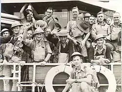 Embarking for Singapore on 2 February 1941 from Darling Harbour on the ocean liner Queen Mary, the battalion arriving at the naval dock in Singapore.[12] Upon arrival, the 2/20th were moved by train to Bagan Pinang and from there marched to Port Dickson,[13] in south-west Malaya where it conducted further training.[4] In early August, Lieutenant Colonel Charles Assheton took over as commanding officer,[14] and the battalion was redeployed to Mersing, constructing defences there.[4] Following the landings on 8 December 1941, the battalion was subsequently involved in fighting against the Japanese as part of the Malayan campaign.[4] The first strikes of the Japanese attack fell on British and Indian troops in the north of the country, and initially the Australian units, which were based in primarily in the south around Johore, did not see much fighting. On 7 January 1942, C Company was detached to form part of a special unit to delay the Japanese advance at Endau on the north coast, clashing with the Japanese on a number of occasions before withdrawing to the battalion main defensive position at Mersing on 26 January. Meanwhile, the remainder of the battalion at Mersing also clashed with the Japanese on a number of occasions, and was heavily bombed. After being rejoined by C Company, the 2/20th Battalion withdrew to Singapore Island on 31 January, where it took up positions on the northern flank of the brigade sector.[4] In the week following the withdrawal from Malaya, the battalion received an influx of about 80 reinforcements, who were largely untrained having been shipped hastily from Australia with little regard to their preparedness, to make up for earlier losses.[15][16]