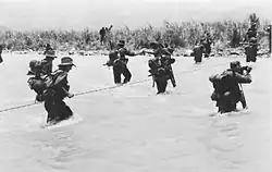 In August 1943, the 2/27th returned to New Guinea and subsequently took part in the Ramu Valley–Finisterre Range campaign, flying into Kaiapit before beginning its advance towards Dumpu in September, which was undertaken following the capture of Lae and the Huon Peninsula campaign as part of efforts to advance towards Madang.[3][35] Advancing through the Ramu Valley towards the range, the 2/27th saw heavy fighting as the 21st Brigade led the 7th Division's efforts to capture the high ground around Shaggy Ridge. In mid-October, the 2/27th helped turn back a heavy Japanese counterattack around John's Knoll and Trevor's Ridge, before the 21st Brigade was relieved.[36][37] Halfway through the campaign, in mid-November, Bishop was replaced as battalion commander by Lieutenant Colonel Keith Picken, and returned to a staff position.[30] Picken subsequently led the battalion throughout the remainder of the war.[38][39] By early January 1944, the 2/27th was withdrawn from the fighting and in March 1944 it returned to Australia.[3]