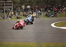 All riders take off and do their usual warm-up lap before lining up in their respective grid slots. As the lights go out, Rossi has a bad start when his rear tyre slides, lacking grip because of the wet track on the opening lap. As he loses positions, Frenchman Régis Laconi takes the lead going into Redgate (Turn 1), followed by Barros and Gibernau - who made up eleven positions to catapult himself into third by the time the group arrived at the Old Hairpin (Turn 4).[7] Both Rossi and Biaggi had dropped down the order significantly, with Rossi being in thirteenth and Biaggi in fifteenth spot halfway around lap 1.[8] McWilliams meanwhile managed to make good use of the chaos and passed eight people to position himself in seventh. At the short straight before Coppice (Turn 8), McWilliams also passes Nobuatsu Aoki for sixth, then passes Roberts before exiting the corner to move himself up into fifth place.[8] Rossi behind has managed to pass Jurgen van den Goorbergh and is now battling José Luis Cardoso for eleventh at Starkey's Straight. At the front, Abe is trying to pass Gibernau around the outside of the entrance at The Esses (Turn 9), but goes a bit wide when he doesn't manage to break properly because of the wet circuit and slots back behind the Spaniard.
