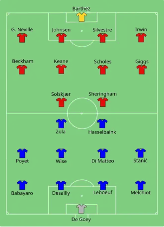 Both teams lined up in a 4–4–2 formation.[19][20] David Beckham was passed fit by Ferguson to play for Manchester United after the midfielder was treated for a back injury he sustained in training.[12][21] Wes Brown and David May were absent with a cruciate ligament and Achilles tendon injury respectively,[12] and Jesper Blomqvist had not recovered from injury to return to first-team action.[14] This was Fabien Barthez's first match.[22]