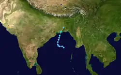Similar to the previous storm, the active monsoon trough spawned a low-pressure area over the Andaman Sea on October 24. There was a weak center that had good outflow. On October 25, the IMD classified the system as a depression about 925 km (575 mi) southeast of Kolkata. The system moved to the northwest and developed more convection close to the center, although the thunderstorms were intermittent. Turning more to the north, the depression intensified into a deep depression and later cyclonic storm on October 27, reaching peak winds of 65 km/h (40 mph); the JTWC also classified it as Tropical Cyclone 02B. That day, the wind shear increased, although the convection was able to increase over the center and organize into a comma-shaped rainband. Early on October 28, the storm made landfall in southern Bangladesh near Mongla, by which time the wind shear had displaced much of the convection to the northeast. It rapidly weakened over land, degenerating into a remnant low over northern Bangladesh early on October 29.[4][9]