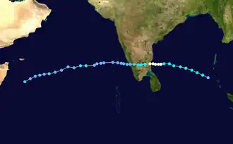 A near-equatorial trough spawned a low-pressure area on December 22 in the central Bay of Bengal. A circulation within the system developed into a depression on December 23 about 500 km (310 mi) east-southeast of Sri Lanka.[4] A low-latitude storm, the system organized while moving slowly westward.[15] On December 24, the depression strengthened into a deep depression, and the following day into a cyclonic storm,[4] the same day that the JTWC classified it as Tropical Cyclone 04B.[15] An eye developed in the center of the blossoming convection, and the system rapidly intensified into a very severe cyclonic storm on December 26. According to the IMD, the cyclone attained peak winds of 165 km/h (105 mph), and made landfall at that intensity along eastern Sri Lanka near Trincomalee around 12:00 UTC on December 26.[4] The JTWC assessed lower winds of 120 km/h (75 mph).[15] Weakening quickly over land, the storm emerged into the Gulf of Mannar on December 27 and failed to restrengthen. Later that day, it made a second landfall in extreme southern India near Thoothukudi as a cyclonic storm. Continuing westward, the system emerged into the Arabian Sea on December 28 as a depression and degenerated into a remnant low. On the next day, the remnant low merged with a trough and spread rainfall northward through India.[4]