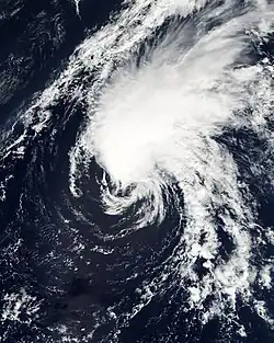 On July 13 a cluster of thunderclouds grouped together to form a low pressure area. On July 14 it started to organize and slowly became a tropical depression on July 19, and quickly intensified into a tropical storm. On July 22 convection was displaced to south of the storm's center due to high wind shear, and caused it to dissipate.