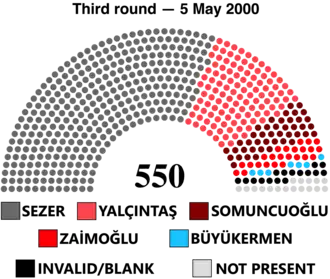 Indirect presidential elections were held in Turkey on 27 April 2000 followed by a second round vote on 1 May and a third on 5 May. It occurred at the end of 9th president Süleyman Demirel's seven-year term in office. There was a small effort to convert Turkey's presidential system into two terms of five years each, which would have given Demirel an additional three years, but this proposal never found widespread support.
