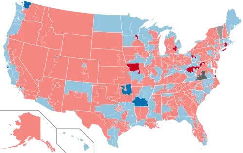 Republicans won the national popular vote for the House of Representatives by a margin of 0.5 points.[5] Republicans lost two seats in the House, while Democrats gained 1 seat and 1 independent, Virgil Goode, was elected.[6] Following the 2000 election, the majority of the House seaters in the South and Midwest were held by the Republican party, while the larger number of seats in the Northeast and West were held by the Democratic party.[7]