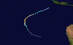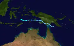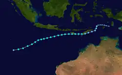 By the 19th conditions were less favourable, and the JTWC indicated that convection was sheared to the west of the well-defined, yet weak, circulation centre. Up to this point, Darwin and JTWC were in agreement regarding the system's strength and its potential for development. However, JTWC issued their first Tropical Cyclone Formation Alert on 21 November, placing the system's center about 200 nm east-northeast of Timor. At 0600 UTC they upgraded the low to a weak tropical cyclone and issued their first warning. JTWC forecast slight strengthening which did not materialise. They issued their second and final warning at 1800 UTC.[3] In their final best track, JTWC held the estimated tropical cyclone-strength intensity through the next day.[4] Though the system was overland for some time, the damage it caused is unknown.