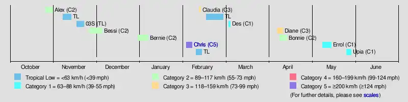 Bernie 30 December – 6 January Category 2 tropical cyclone 95 km/h (60 mph) 980 hPa (28.94 inHg) Northern Territory Unknown Unknown [31]