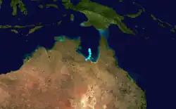By 9 February a monsoon low had formed inland about 220 kilometers southwest of Darwin. This system drifted eastward over land, reaching the shoreline on the Gulf of Carpentaria on 13 February. TCWC Darwin anticipated tropical cyclone development for the system, and had issued Tropical Cyclone Advices for this system on 12 February and 13 February. However, development failed to materialize.[20] The monsoon low in conjunction with the active trough over Northern Territory produced floods in several of the area's river systems. Major flooding in the Wickham River tributary caused moderate flooding in the Victoria River. The Waterhouse River began rising on 12 February, forcing 500 people to evacuate. Katherine was threatened, but did not flood when the Katherine River rose to a peak of 17.03 metres on 14 February.[29]