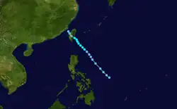 Utor spawned from an area of convection that developed off 907 km (565 mi) south-southeast of Guam on June 26, that remained quasi-stationary for 2 days before upgrading to a tropical depression on July 1 due to favorable conditions such as low vertical shear.[27] The depression strengthen into a tropical storm at 00:00 UTC on July 2.[13][27] Utor tracked west-northwest from a peripheral ridge and developed further, after entering the Philippine Area of Responsibility, and attained severe tropical storm status the following day. Utor was a large cyclone, with gale-force wind of 250 nmi (465 km; 290 mi).[11] Utor reached its peak strength on June 4, with 10-minute winds of 110 km/h (70 mph) and 1-minute winds of 150 km/h (95 mph), with the barometric pressure of 960 hPa (28 inHg).[13][11] Utor was centered 56 km (35 mi) near northern Luzon and tracked northwesterly as it began to weaken.[27] The storm made landfall near the east of Hong Kong on July 5 and quickly weakened before being last noted on July 7 by the JMA.[13]