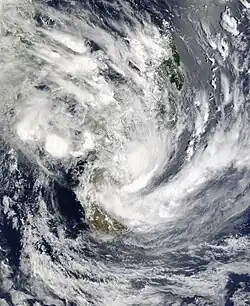 Early in its duration, Gerry passed just west of Tromelin Island, producing tropical storm force winds and gusts to 111 km/h (69 mph). The cyclone originally threatened to strike Mauritius directly, but due to a more east-south-easterly motion, Gerry passed more to the east.[31] The storm forced the closure of Sir Seewoosagur Ramgoolam International Airport,[32] along with schools and government offices.[33] Wind gusts on Mauritius reached 144 km/h (89 mph). Gerry dropped heavy rainfall, peaking at 139.2 mm (5.48 in) at Mare aux Vacoas, and it produced high waves along the northern coast. One person was killed who was electrocuted during the storm's passage.[31]