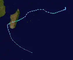 On February 5, MFR began tracking a tropical disturbance to the east of Madagascar's northern coast. The system moved to the south-west before turning to the north on February 7.[30] By that day, the system had persistent convection around a weak circulation, located in an area of low wind shear. On February 8, the JTWC initiated advisories on Tropical Cyclone 16S, although initially the circulation was broad and exposed from the thunderstorms. The next day, MFR upgraded the depression to tropical storm status, and the Meteorological Services of Mauritius named the system Gerry. The storm turned to the south toward Mauritius and steadily intensified.[31] On February 12, the JTWC upgraded Gerry to the equivalent of a minimal hurricane, and shortly thereafter MFR upgraded the storm to a tropical cyclone.[30] Around that time, Gerry began undergoing rapid deepening, becoming an intense tropical cyclone early on February 13 while developing a well-defined eye and outflow. That day, the cyclone passed about 120 km (75 mi) east of Mauritius.[31] At that time, the JTWC estimated peak 1 minute winds of 195 km/h (121 mph), and MFR estimated peak 10 minute winds of 165 km/h (103 mph).[30] Subsequently, Gerry began weakening due to increasing wind shear, with the eye becoming disorganized. Later, the convection separated from the deepest convection,[31] and the cyclone weakened to tropical storm status on February 14.[30] The next day, JTWC discontinued advisories, and on February 16 MFR declared Jerry extratropical.[31] The remnants dissipated two days later.[30]