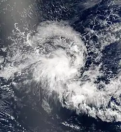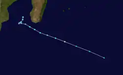 In late August, a weak low-level circulation persisted near Diego Garcia. It was associated with a trough near the equator, and initially remained disorganized due to high wind shear. The disturbance was located at a low latitude near the equator, and a ridge extending from the eastern coast of Africa imparted a general west-south-west movement.[8] The system was organized enough to be classified by MFR on September 5 at 3.1° S.[9] Subsequently, the system developed more convection as its circulation became better defined. Operationally, MFR began issuing warnings on September 5 on Tropical Disturbance 01, and the next day upgraded it to a tropical depression.[8] Post analysis from MFR indicated that the system reached peak winds of 65 km/h (40 mph) on September 6,[9] the same day that the Joint Typhoon Warning Center (JTWC) initiated advisories on it as Tropical Cyclone 01S. The storm developed banding features, but the thunderstorms were sheared away from the circulation. On September 7, the storm moved through Seychelles—an island nation in the southern Indian Ocean—before weakening. MFR discontinued advisories on September 8, and the JTWC followed suit the next day.[8]