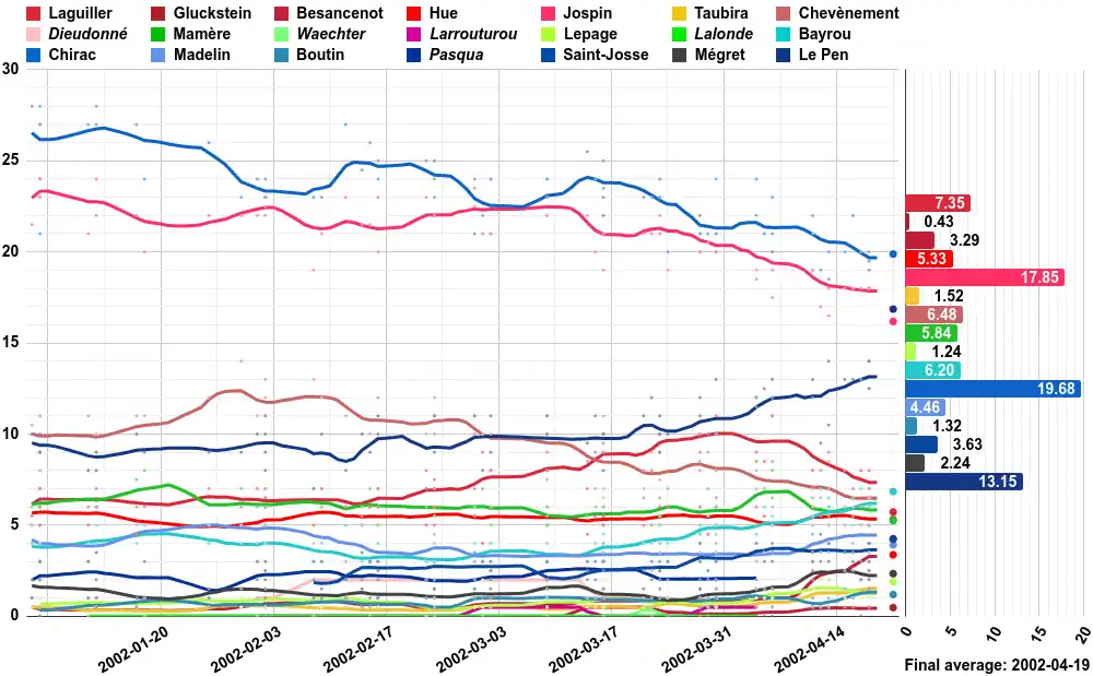 The first round of the election (on 21 April), which saw an exceptional number of 16 candidates, came as a shock to many commentators, almost all of whom had expected the second ballot to be between Jacques Chirac and Lionel Jospin. Indeed, it was this very expectation that led to Jospin's downfall, with a plethora of "small party" left candidates (independent socialists and republicans, Green, Communist, Trotskyist, radical etc.) all intending to support him in the second round, but to raise their profile in the first, like Jean-Pierre Chevènement and Christiane Taubira. They cumulatively took enough votes away from Jospin to (unintentionally) prevent him from reaching the second round, which he could have won. Instead Jean-Marie Le Pen faced Chirac in the second ballot. The election brought the opinion polls and two-round voting system into question as well as raising many concerns about apathy and the way in which the left had become so divided as a result of the over democratic refusal of Jospin to strategically ask the nearest small parties of his own government coalition to withdraw, like the preceding leaders of the left had done for such an election.