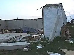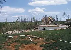 Many of the "slider homes" swept off their foundation were rated F1 to F3, with surveyors having to rely solely on the severity of the surrounding damage to determine ratings.[10] This includes the toppled steel water tower in La Plata, which "was impressive but occurred in an area of F1 damage". This event highlighted key limitations of the Fujita scale and is largely responsible for how tornadoes are surveyed today.[11]