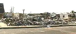 F3 damage continued into West Quail Lane, where several homes were completely leveled. The tornado then entered La Plata and struck the Archbishop Neale School, where heavy cement slabs that formed the roof were picked up and dropped into classrooms. Several walls were also "torn away". As the tornado progressed into La Plata, it strengthened and expanded to a width of nearly half a mile (0.8 km). Swaths of F3 and F4 damage also began occurring throughout town. These swaths and eyewitness reports indicate that the tornado was multi-vortex. Along Route 6, vehicles were lifted and tossed, while the 125-foot city steel water tower was bent and toppled. At the Posies Market, only a few walls were left standing. East of the La Plata shopping center, where a CVS Pharmacy was destroyed, a KFC was leveled. Next to this, a historical town sign and its concrete foundation were pulled out of the ground.[13] Entire Utility poles were also snapped and thrown. Along Saint Marys Avenue, the brick and steel lumber yard building were demolished. "Heavy F4 damage" occurred just east of this.[8] A brand new brick orthodontist office was completely leveled after taking a direct hit. Two multi-story homes sustained F4 damage next to the railroad tracks where there "was was little to nothing left" of them and their garages.