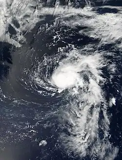 In the beginning of April, a tropical disturbance developed along the southern end of a stationary cold front west of Enewetak Atoll.[11] While gradually organizing, the system produced gale-force wind gusts in Micronesia.[25] On April 5, the JTWC initiated advisories on Tropical Depression 04W. The system moved northwestward due to a nearby extratropical storm, which later caused the depression to also become extratropical about 650 km (400 mi) west-southwest of Wake Atoll.[11] The JMA issued its last advisory on April 8.[11]