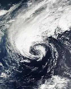 While accelerating northeastward, Hagibis developed a well-defined eye and underwent a period of rapid deepening.[26] On May 19, the JMA estimated peak 10-minute winds of 175 km/h (109 mph),[10] and the JTWC estimated 1-minute winds of 260 km/h (160 mph);[11] this made Hagibis become a second super typhoon after Mitag. At the time of its peak, the typhoon was located about 305 km (190 mi) west-southwest of the Northern Mariana Islands.[26] Hagibis only maintained its peak for about 12 hours,[10] after which the eye began weakening.[26] The trough that caused the typhoon's acceleration also caused the storm to lose tropical characteristics, and dry air gradually became entrained in the circulation.[26] On May 21, Hagibis became extratropical to the east of Japan after having weakened below typhoon intensity. The remnants continued to the northeast and dissipated south of the Aleutian Islands on May 22.[10]