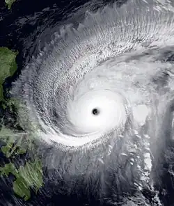 After affecting Yap, Mitag turned to the northwest and later to the north due to an approaching trough.[11] It passed to the north of Palau, contributing to one death there. Despite predictions of weakening,[21] the typhoon continued to intensify, reaching peak 10-minute winds of 175 km/h (109 mph) on March 5.[10] The JTWC estimated peak 1-minute winds of 260 km/h (160 mph) when the storm was about 610 km (380 mi) east of Catanduanes in the Philippines; this made Mitag became a super typhoon, the first one on record in the month of March. The combination of cooler air and interaction with the westerlies caused Mitag to weaken significantly. Only four days after reaching peak winds, the storm had dissipated well to the east of the Philippines.[21]