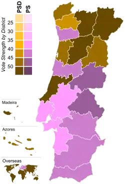 With just over 40 percent of the votes cast, the Social Democrats regained the status as the largest political force in Portugal, although the Socialists won almost 38 percent of the vote. This was the closest legislative election in Portuguese democracy until 2024. This short distance also appears on the electoral map, with each party winning eleven of the 22 districts, while the PS won the most populous, Lisbon and Porto. As a result, the Social Democrats fail to win the absolute majority they had between 1987 and 1995.