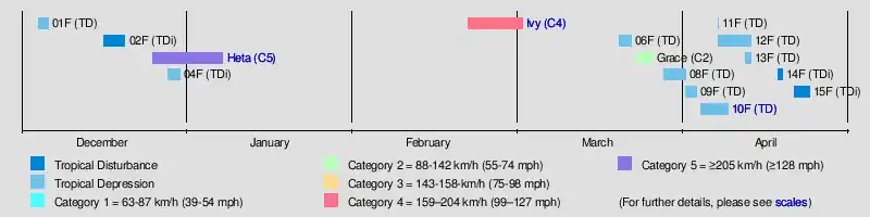 | Ivy | February 21 – 28 | Category 4 severe tropical cyclone | 165 km/h (105 mph) | 935 hPa (27.61 inHg) | Vanuatu, Solomon Islands, New Caledonia, New Zealand | $3.8 million | 4 | |