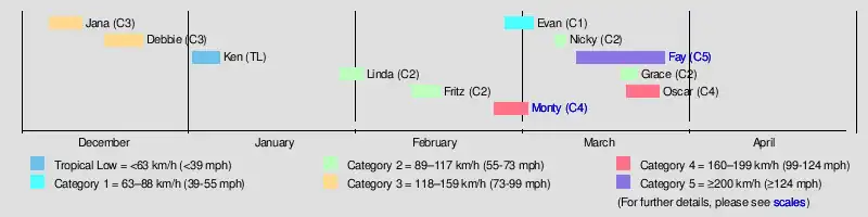 Fay 12–28 March Category 5 severe tropical cyclone 215 km/h (130 mph) 910 hPa (26.87 inHg) Northern Territory, Western Australia Minimal None