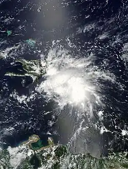 A strong tropical wave moved off the coast of Africa on August 14,[56] and after tracking steadily westward an area of convection began to become better organized on August 18.[57] After it tracked through the Lesser Antilles, it developed into Tropical Depression Nine on August 21 to the south of Puerto Rico. The depression quickly showed signs of organization, and forecasters predicted the depression to intensify to a strong tropical storm.[58] However, strong southwesterly wind shear unexpectedly became established over the system, and the depression degenerated into a tropical wave late on August 22 to the south of the eastern tip of the Dominican Republic.[56]