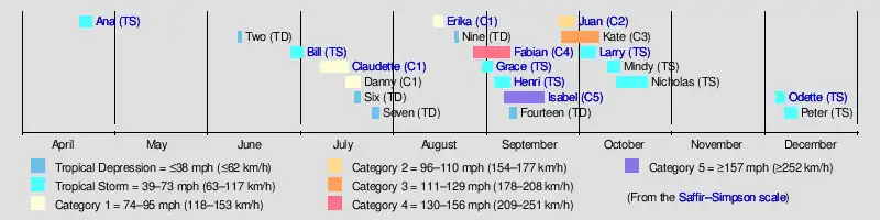Overall, the season's activity was reflected with a high cumulative accumulated cyclone energy (ACE) rating of 176.[14] ACE is, broadly speaking, a measure of the power of the hurricane multiplied by the length of time it existed, so storms that last a long time, as well as particularly strong hurricanes, like Isabel and Fabian, have high ACEs. ACE is only calculated for full advisories on tropical systems at or exceeding 34 knots (39 mph (63 km/h) or tropical storm strength. Subtropical cyclones are excluded from the total.[15]