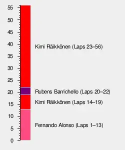 The podium positions stayed that way with Räikkönen cutting into the lead when Alonso pitted first out of the front three on lap 14, a sign that he was carrying a lighter fuel load during qualifying. Alonso did break the record for youngest driver to lead a race (the previous record having remained since 1951). Räikkönen circulated until lap 19, using the lighter fuel load to post faster lap times, and after his pit stop emerged ahead of Alonso.