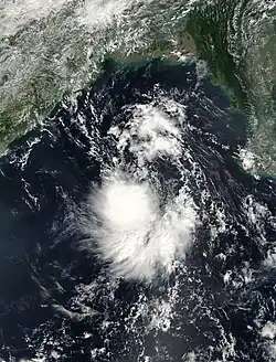 On December 10, an area of convection with an associated circulation persisted about 740 km (460 mi) west of the northern tip of Sumatra, as part of a trough in the region and enhanced by the monsoon. A steady decline in the wind shear allowed the thunderstorms to organize,[23] and a depression formed on December 11.[1] On the next day, the JTWC initiated advisories on Tropical Cyclone 03B. The storm moved generally northwestward, steered by a ridge to the north.[23] The IMD upgraded the system to a deep depression and later cyclonic storm on December 13, and further to a severe cyclonic storm a day later. The agency estimated peak winds of 100 km/h (60 mph), noting spiral convection organizing around the beginnings of an eye feature.[1] The storm also developed well-defined outflow due to an approaching trough from the west. At around 14:30 UTC on December 15, the storm made landfall near False Divi Point in southeastern India,[23] along the coast of Andhra Pradesh. After turning to the northeast over land, the system rapidly weakened, degenerating into a remnant low on December 16.[1]