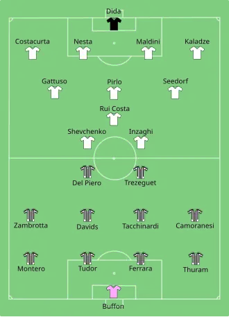After a brisk start, Milan had an Andriy Shevchenko goal ruled out after Rui Costa was deemed to have blocked Gianluigi Buffon's line of view from an offside position, although television replays showed that the Portuguese had moved out of Buffon's line of sight seconds before the shot. Antonio Conte nearly scored for Juventus after coming on as a substitute at half time, his header clattering against the post with Dida beaten. Andrea Pirlo also hit the bar for Milan. In the second half, both teams began to sit back and created fewer chances despite fielding more attacking players; while Milan went from 4-4-2 diamond to the classic 4-4-2 with Serginho and Rui Costa (later Seedorf) as left and right midfielders, Juventus brought in Marcelo Zalayeta to pair with David Trezeguet, with Alessandro Del Piero also present on the pitch as a left winger (a position normally occupied by the suspended Pavel Nedved) and Gianluca Zambrotta moving onto the right.