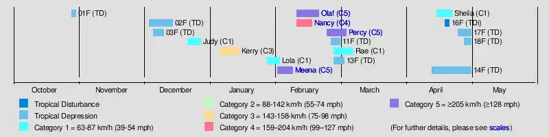 The first tropical depression of the season developed on October 28 to the northeast of Guadalcanal in the Solomon Islands. Over the next few days the system moved westwards and moved into the Australian region during October 30. There were no significant tropical disturbances observed during November, before Tropical Depression 02F developed to the north of Vanuatu during December 3. The system subsequently meandered over the ocean between Vanuatu and Fiji, before it was last noted to the southeast of Vanuatu during December 14. While Tropical Depression 02F was active, the third tropical depression of the season, developed to the south of Tuvalu on December 5. The system subsequently moved south-eastwards, before it was last noted during December 10 to the east of Nuku'alofa, Tonga. The fourth tropical disturbance of the season developed during December 21 and subsequently moved south-westwards, before it was named Judy during December 24, as it developed into the first tropical cyclone of the season.
