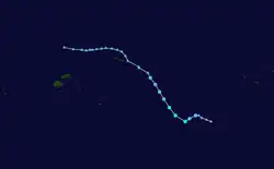 Tropical Depression 01F developed on October 28, within the monsoon trough about 420 km (260 mi) to the northeast of Guadalcanal.[14][15] Over the next couple of days the system moved westwards and moved into the Australian region, during October 30, where it was monitored for a few days by TCWC Brisbane.[14] The second tropical depression of the season developed on December 3, about 280 km (170 mi) to the north of Port Villa, Vanuatu.[2] Over the next week the poorly organised system meandered over the ocean between Vanuatu and Fiji, before it started to organise during December 12, with RSMC Nadi issuing gale warnings on the system.[2] The system subsequently moved southwards between Vanuatu and Fiji, before it was last noted during December 14, while it was located to the southeast of Port Villa.[2] While Tropical Depression 02F was active, the third tropical depression of the season, developed to the south of Tuvalu on December 5.[2] The system subsequently moved south-eastwards, before it was last noted during December 10 to the east of Nuku'alofa, Tonga.[2]