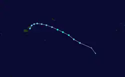 During April 20 Tropical Disturbance 16F developed within a monsoon trough, about 570 km (350 mi) to the southeast of Apia on the Samoan island: Upolu.[18] During April 21, the disturbance moved towards the southwest and affected Niue while starting to rapidly weaken, before it was last noted during April 22 wrapping into Cyclone Sheila's circulation.[19][20][21] Tropical Depression 17F then developed on April 26 while located about 710 km (440 mi) to the northeast of Pago-Pago in American Samoa.