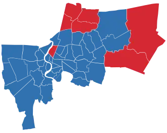 Gubernatorial election results map. Blue denotes districts won by Kosayothin, Red denotes those won by Hongsakul |