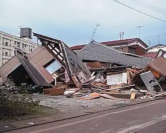The first quake struck the Chuetsu area of Niigata Prefecture, Japan on the Muikamachi Fault zone,[4] with a reading of 7 on the Japanese shindo intensity scale at Kawaguchi, Niigata.[2] The moment magnitude of the earthquake is estimated at 6.6.[1] For comparison, the Great Hanshin earthquake, which devastated much of Kobe, measured 7 on the shindo scale, with a magnitude of 7.3.[5] The earthquake occurred at a depth of 15.8 km. The JMA gave the coordinates of the earthquake as 37°18′N 138°48′E / 37.3°N 138.8°E.