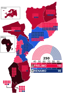General elections were held in Mozambique on 1 and 2 December 2004 to elect a president and the Assembly of the Republic. Incumbent president Joaquim Chissano stepped down after 18 years in power, with five candidates running to succeed him. Armando Guebuza of the ruling FRELIMO party won, with over 60% of the vote. FRELIMO also won the Assembly elections, taking 160 of the 250 seats. Turnout for both elections was just over 36%.[1]
