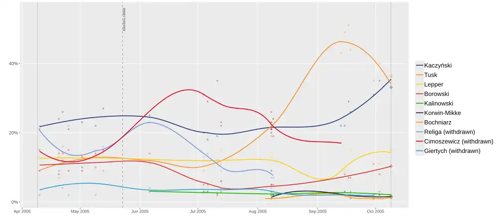 Presidential elections were held in Poland on 9 October and 23 October 2005. The outgoing President of Poland, Aleksander Kwaśniewski, had served the two five-year terms allowed under the constitution and was unable to stand for a third term. Lech Kaczyński defeated Donald Tusk to become President of Poland.