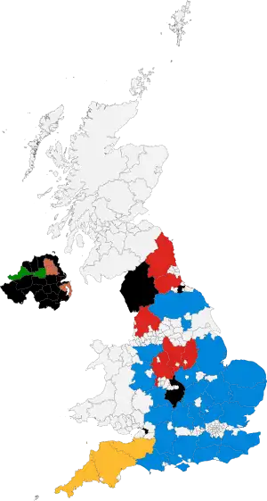 All 34 non-metropolitan counties, 3 out of 46 unitary authorities, 1 sui generis authority, 4 directly elected mayors and all 26 Northern Irish districts | |||||||||||||||||||||||||||||||||||||||||||||
