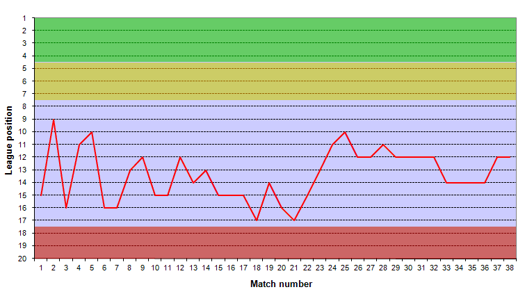 This chart shows the league position of Middlesbrough F.C. over the course of the season. The green area represents the UEFA Champions League positions (positions 1 to 4), the yellow area represents what turned out to be the UEFA Cup positions (positions 5 to 7) and the red area represents the relegation places (positions 18 to 20). The lowest position in the league that Middlesbrough reached during the course of the season was 18th, prior to the home game versus Charlton Athletic on 23 December 2006 (an early kick-off result had knocked them down from 17th), and their highest placing was 9th, after the second game.