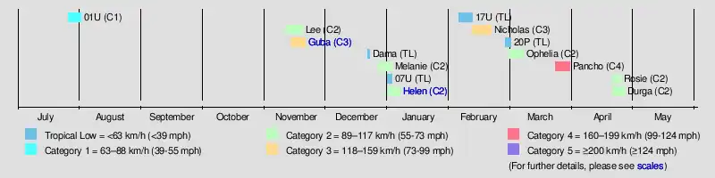 Pancho 25–29 March Category 4 tropical cyclone 165 km/h (103 mph) 938 hPa (27.70 inHg) Christmas Island, Western Australia None None